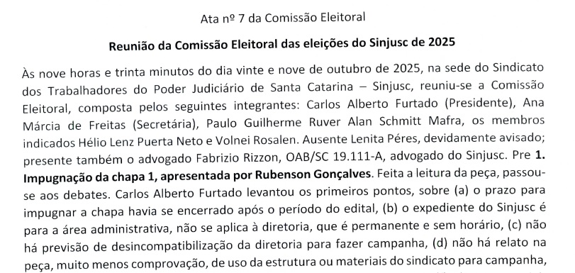 Ata nº 7 da Comissão Eleitoral Reunião da Comissão Eleitoral das eleições do Sinjusc de 2025 Às nove horas e trinta minutos do dia vinte […]